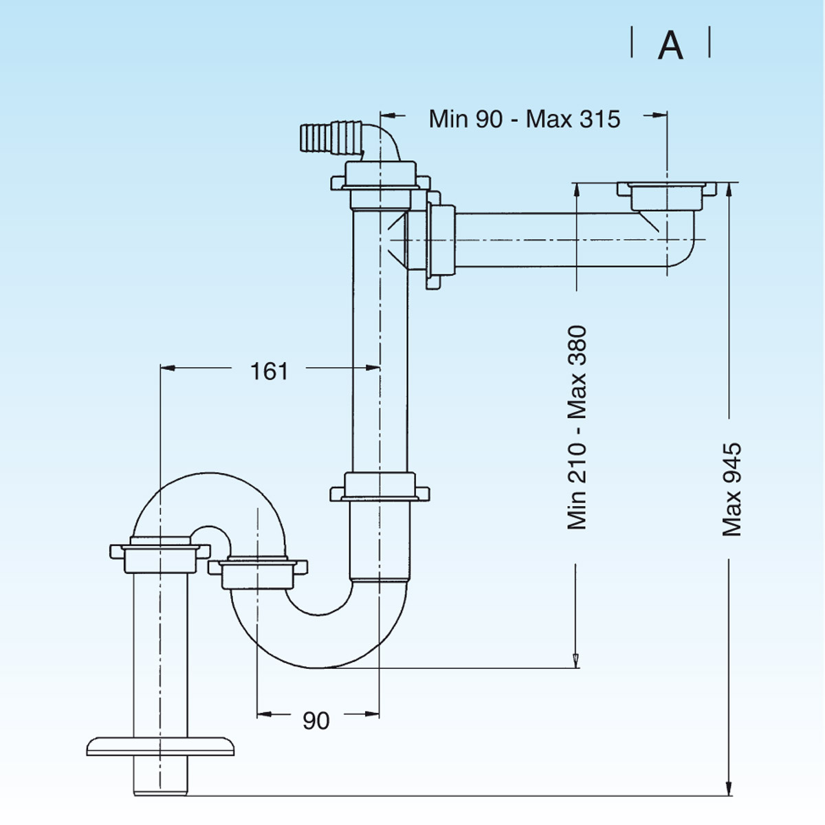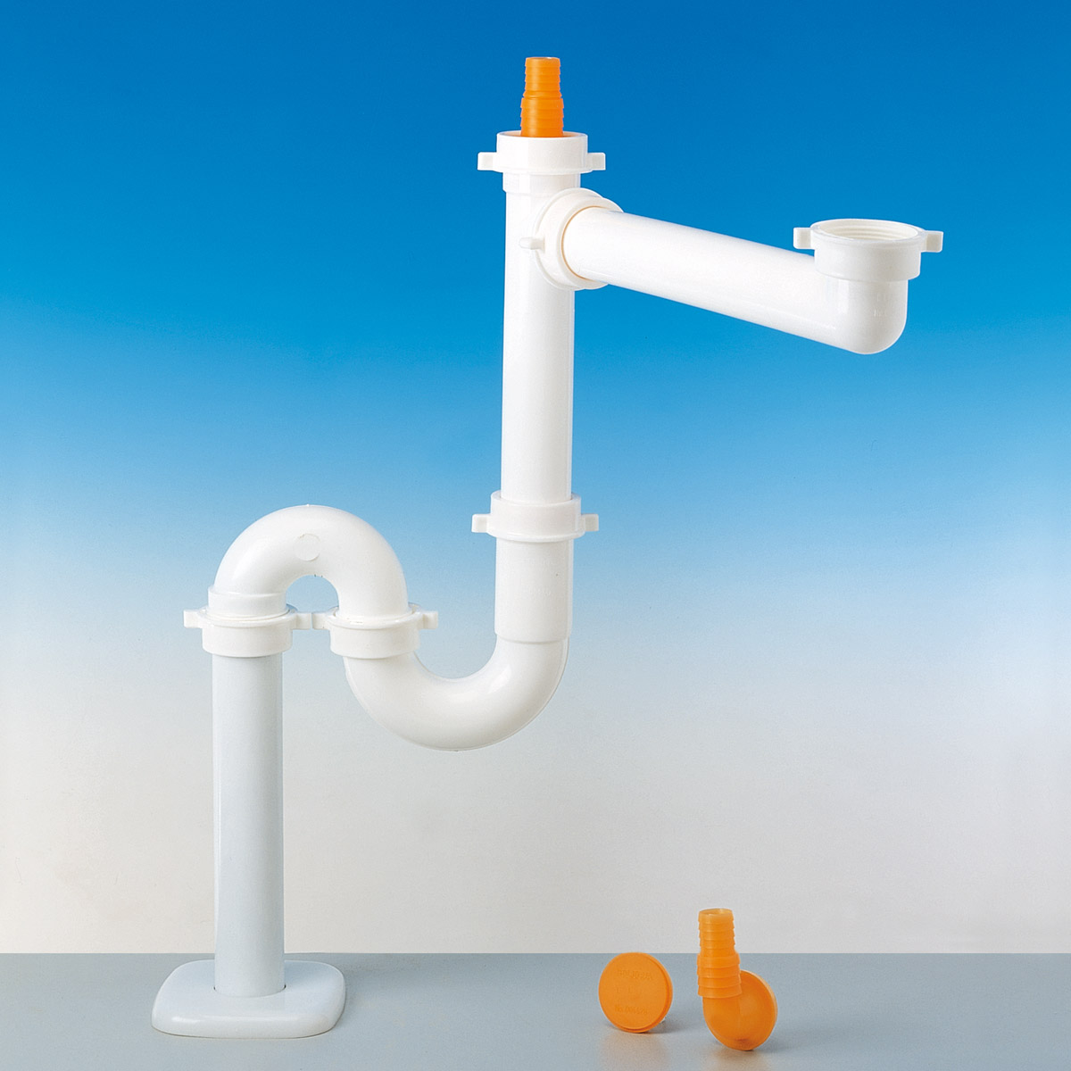 Platzsparsiphon für Spülen mit einem Becken mit Bodenablauf.