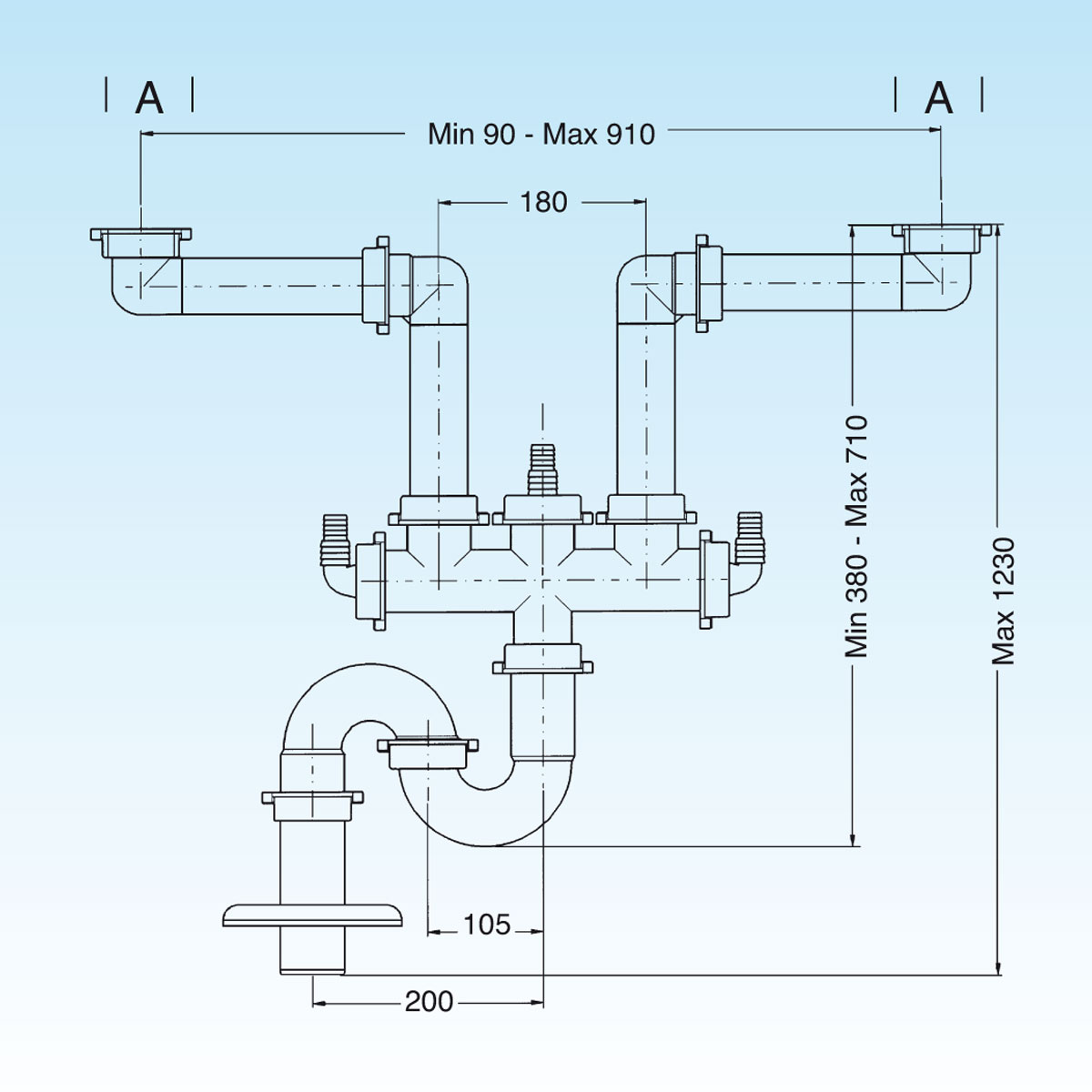 Raumsparsiphon für Gewerbespülen mit zwei Becken