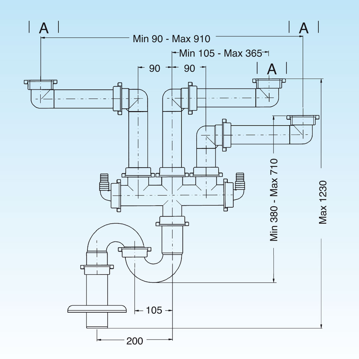 Siphon gain de place pour éviers collectivité avec trois bassines