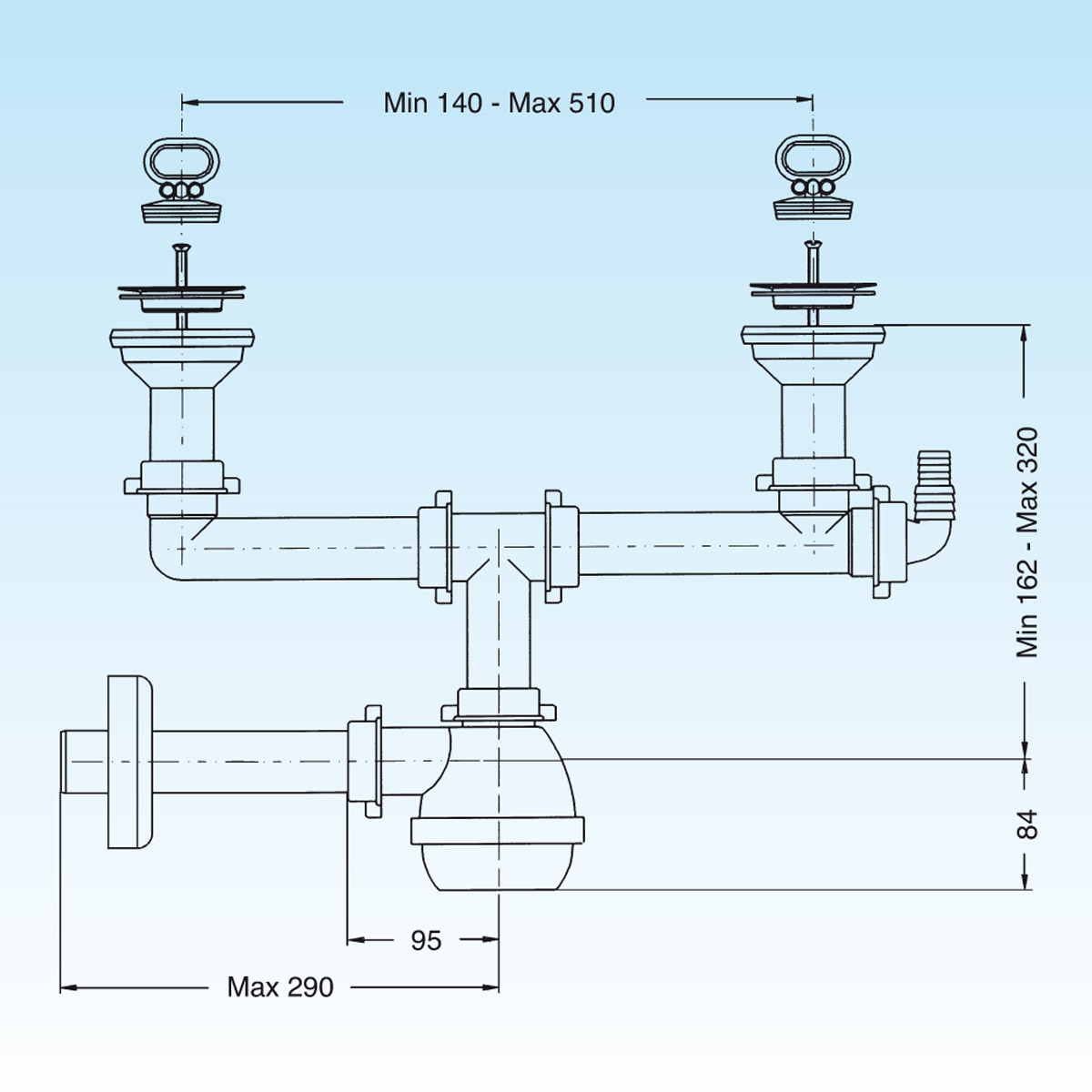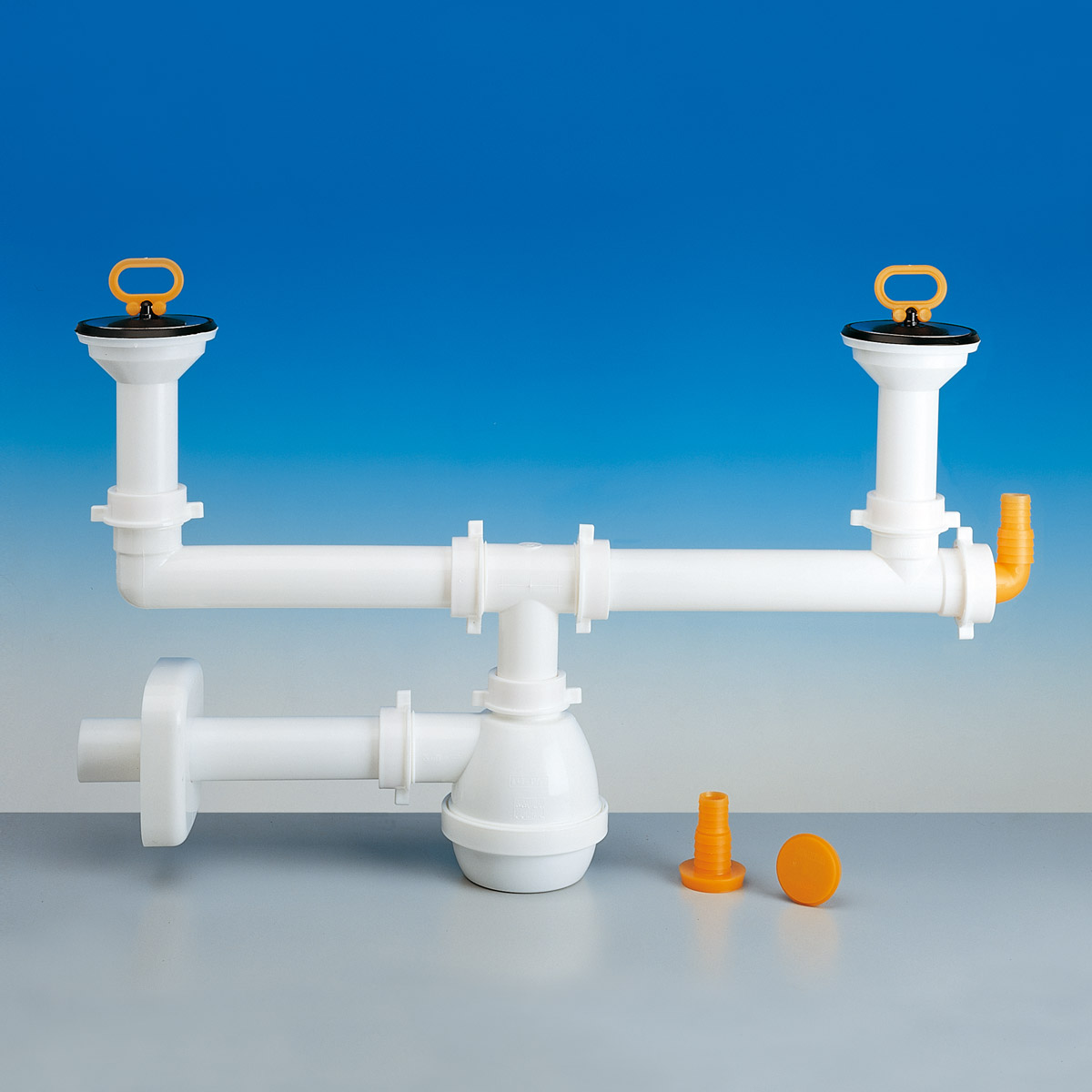 Sifoni tipo “M” per lavelli in ceramica a due vasche, completi di pilette, (acciaio inox 18/8 - Ø 80x52), tappomaniglia